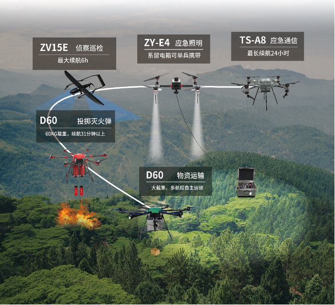 为应对林火侦查和扑救带来的诸多难题,如何及时的“打早、打小、打了”,成为提升森林防灭火效率的关键。卓翼智能以ZV15E长时间空中侦查、D60灭火处置和物资保障运输,E4系留无人机的照明,A8系留无人机通讯中继和空天地一体化管控平台相结合,以无人机搭载AI智能识别平台为核心,聚焦森林防灭火,打造了空天地一体化森林消防无人装备解决方案。