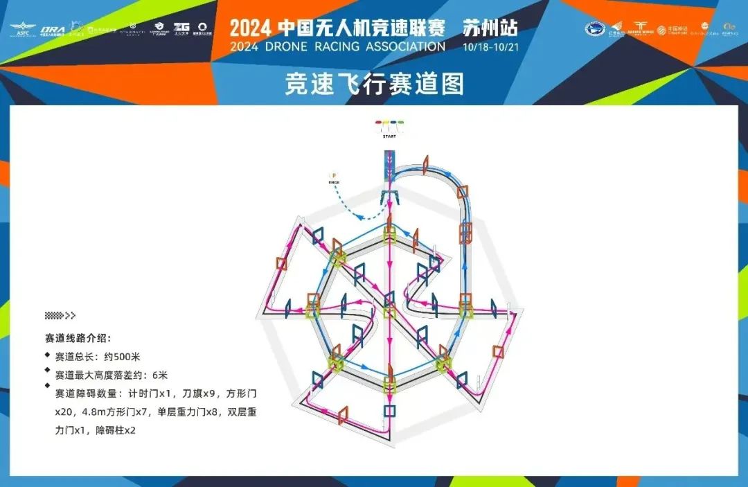 苏州站以”穿越山水,翼展新城“为主题,且与世锦赛赛道相似,赛道总长约500米,障碍门约50多个。其中设立公开组,女子组以及青少年组三类奖项