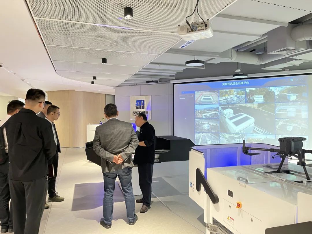 在昊舜展厅,研发人员展示了昊舜视讯自主研发的无人机系列产品、无人机机场系列产品及配套智控系统。陆福明详细介绍了公司在无人机智能巡检、AI识别等领域的最新成果。随后,文成县领导参观了生产部,对无人机全自动机场产品的生产组装、质量检测过程及其严格的质量控制标准和高效运营表示了高度赞赏。