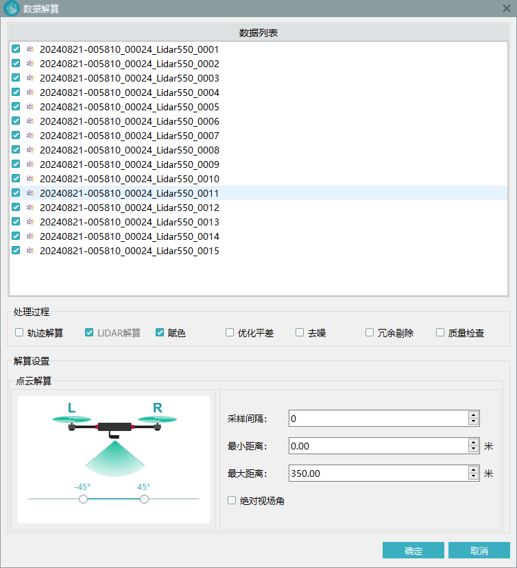 为了方便用户使用,【点云解算】界面支持同时勾选“解算”、“赋色”、“平差”、“去噪”、“冗余剔除”、“质量检查”等功能,您可以实现一键获取标准点云成果。