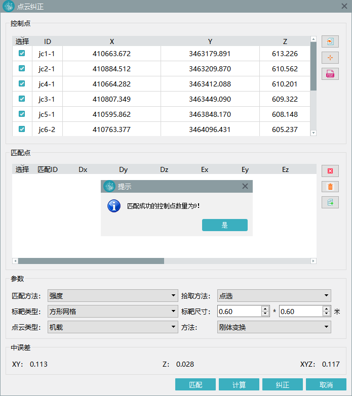 【点云纠正】为提高激光雷达数据精度的功能。通过内业拾取标靶中心点与外业实测点位进行误差统计,借助软件优化算法,来提高激光雷达数据的平面及高程精度。