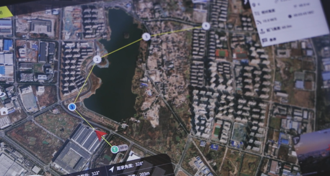 无人机升空后,A点通过遥控器实时追踪无人机的飞行轨迹、画面传输、电池电量等信息。