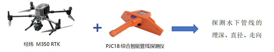 针对近岸滩涂及软土区或淤质泥土的管线探测,采用大疆M350RTK无人机,搭载轻质高强度碳纤维连接套件,连接鹏锦科技自研的高精度、高灵敏性的PJC18综合智能管线探测仪(可穿透任何介质,探测深度可达0-9米)。在航高约为5米范围内进行近岸滩涂及软土区或淤质泥土的管线探测。