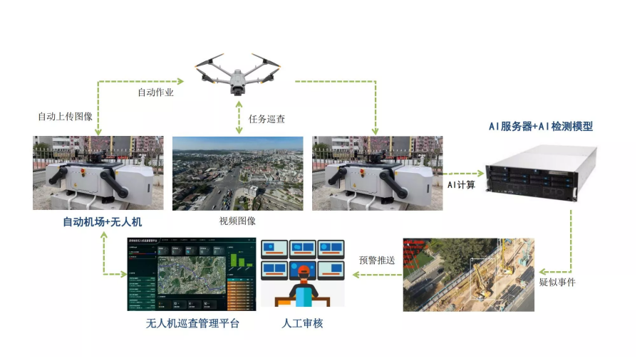 大疆机场 2 采用高防护、轻量化设计,并配备专有的 Martice 3D 系列无人机,通过自身视觉传感器能够检测周围环境遮挡情况,快速判断目标区域是否满足部署条件。根据业务需求,定制 AI 智能识别算法,构建全流程、智能化巡查监管体系,无需投入大量人力物力进行业务巡查监管,极大程度提高巡查效率及问题处理效率。