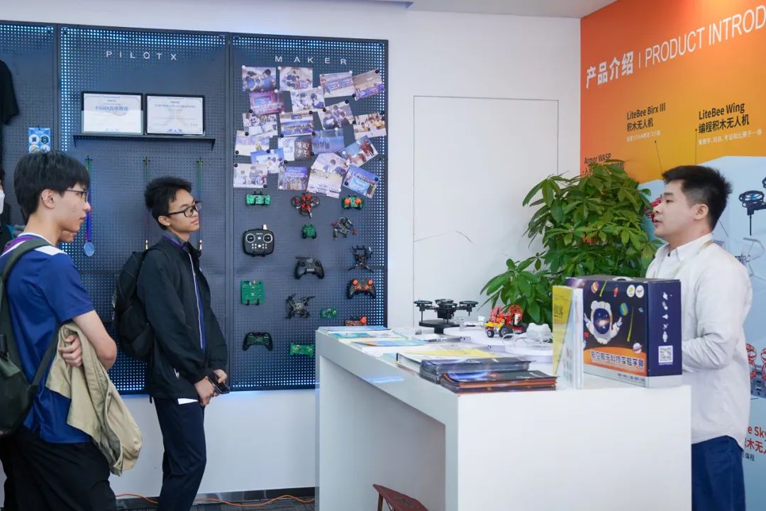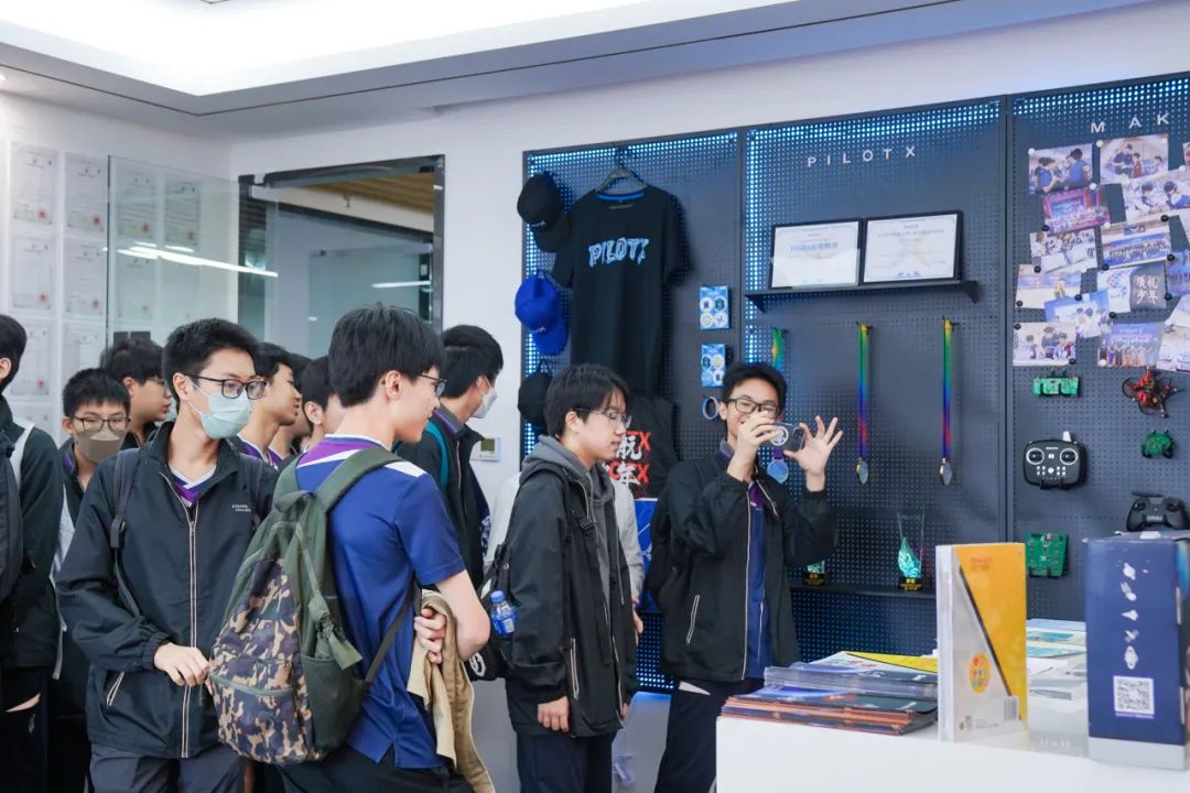在参观的过程中,销售经理向同学们细心讲解了每一款教育系列无人机产品的性能和特色,其中展品包括了“PilotX领航少年”赛事品牌周边,该比赛专为全球无人机爱好者打造的竞技和技术交流的平台,鼓励青少年勇敢地迎接挑战,彼此相互交流、合作,探索未来,同学们对赛事产生了极大的兴趣,纷纷表示想要参加体验。