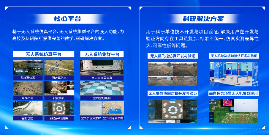 基于无人系统仿真平台、无人系统集群平台的强大功能,为高校及科研院所提供完善的科研解决方案。主要用于科研单位技术开发与项目验证,解决用户在开发与验证方向存在工具链复杂、标准不统一、仿真实测差异性大、可靠性低等问题。