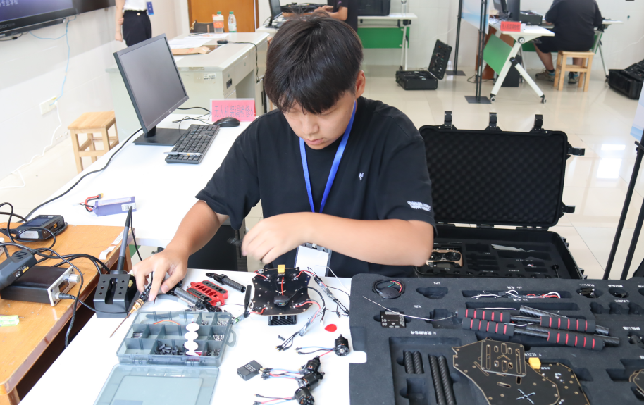 无人机装调检修赛项:为无人机配件和工具检查、无人机零部件选型、机体结构装配、电子元件焊接、整体工艺安装、系统调试、性能测试及检修能力等。