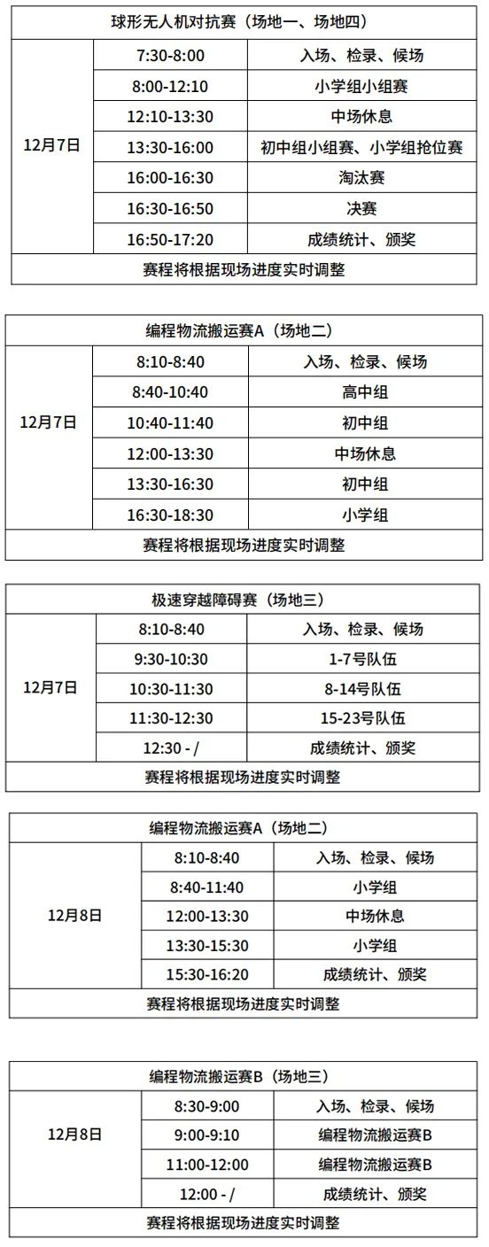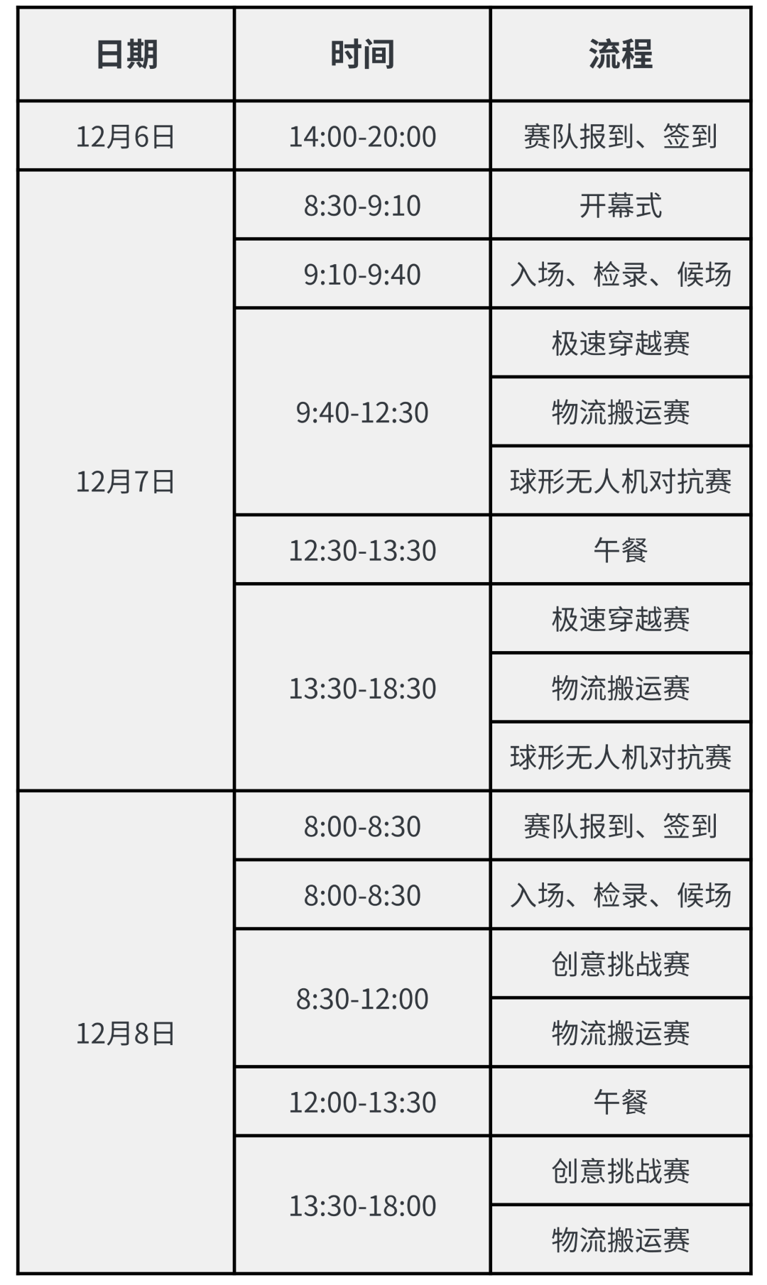 12月7日-8日,全天设有报到点,保障所有选手顺利报到进入赛场,正式比赛日报到时间截止后,将不再受理报到和检录事宜,未报到队伍不得参赛。