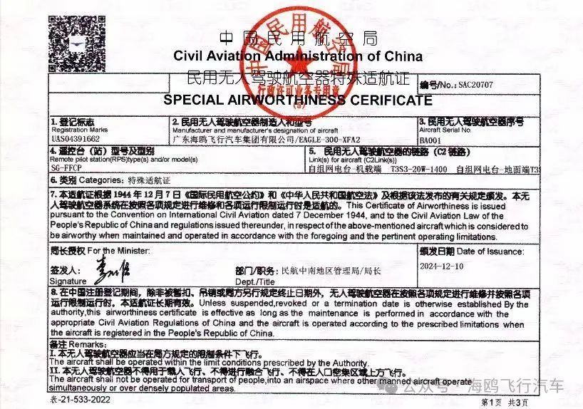 12月10日 ,海鸥飞行汽车集团EAGLE-300- XFA2智能消防无人机获得中国民用航空局颁发的《民用无人驾驶航空器特殊适航证》,成为全国首款获此证的大型多旋翼无人机,最大起飞重量600kg,标志着EAGLE-300-XFA2在安全规范、设计验证、试飞验证、安全功能测试以及运行范围等方面通过了《民用无人驾驶航空器系统适航安全评定指南》的安全评定要求,已具备执行特定运行活动的安全水平。特殊适航证不仅是航空器安全性的证明,也是在低空经济中,“持证上岗”的通行证。