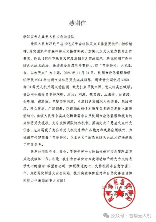 杭州市应急管理局在感谢信中特别提到:“贵公司团队专业、敬业,不辞辛苦全力协助我们完成此次演练工作。”并希望未来能够继续得到浙江省天之翼无人机应急救援队的支持,共同致力于防范化解重大安全风险,提高突发事件的应对水平。