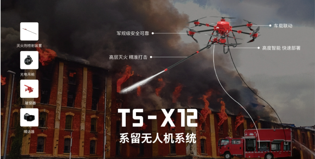 TS-X12消防无人机具备60kg大载重能力,能够飞行在150米高空并保持长时间悬停,从而提供持续的灭火能力。