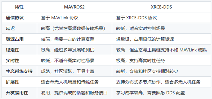 如果用户追求最新,那么选择XRCE-DDS可以带来的显著优势:实时性和通信效率高,也就是提供更高效的性能和更低的延迟。但如果用户还是习惯 MAVLink 框架,或者还是需要 MAVLink 框架,选择MAVROS2, 更易用,工具支持更丰富,现有的资料都很齐全完整,用户根据自己需求选择。