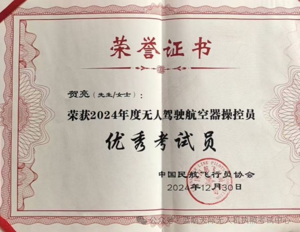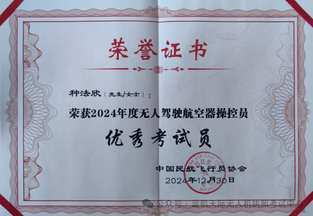 蓝航天际教员贺亮与种法欣荣获2024年度无人驾驶航空器操控员优秀考试员。