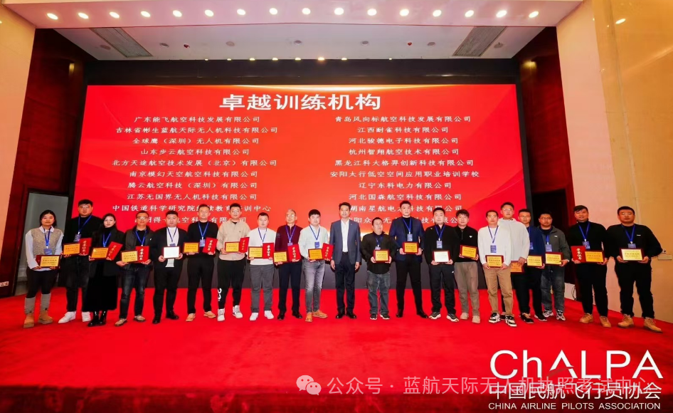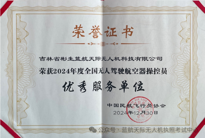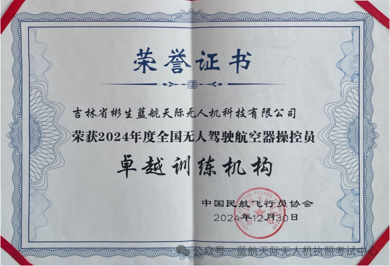 蓝航天际凭借卓越的教学品质与专业的服务水准,荣获了 “2024 年度全国无人驾驶航空器操控员优秀服务单位” 与 “2024 年度全国无人驾驶航空器操控员卓越训练机构”两项荣誉。