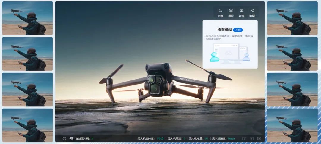用户可实时监控无人机,支持画面切换、详情查看和数据查询。平台与飞手端实现通话连线,提供音视频通话功能,支持无人机飞手端通话,实现实时连线,体验音视频通话能力,以增强远程协作,提高工作效率。