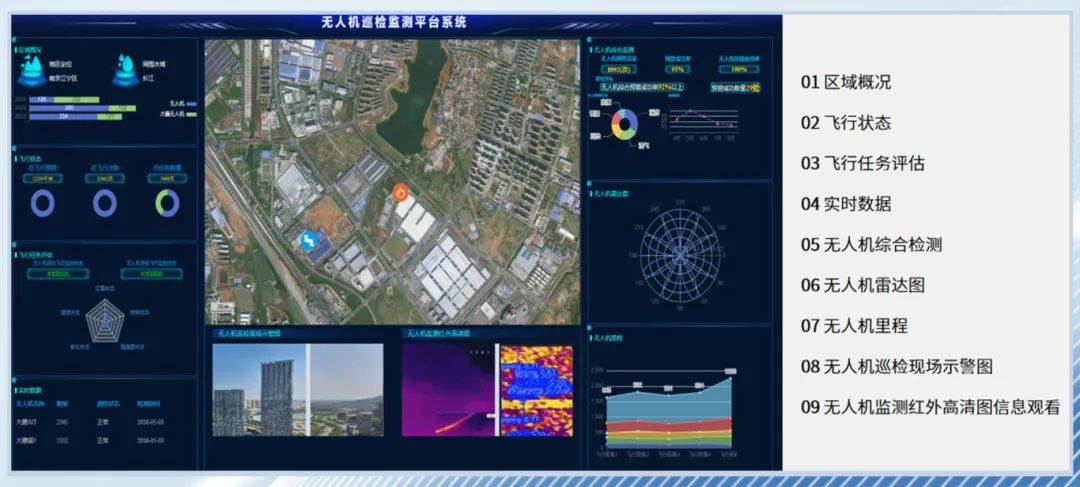 展示区域全景概况,精准掌握整体飞行状态。实时更新无人机飞行信息,涵盖飞行状态、区域概况、飞行里程、实时数据等关键数据。通过智能评估飞行任务,优化飞行路径规划,提升作业效率与安全性。