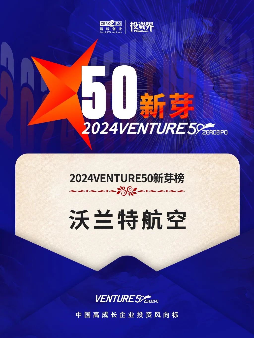 2025年1月9日,2024VENTURE50评选结果揭晓。沃兰特航空荣登“2024投资界硬科技VENTURE50”和“2024VENTURE50新芽榜”双榜,入选2024中国最具投资价值企业50强。成立于2021年6月的沃兰特航空,专注于高等级客运eVTOL研制。首款机型VE25-100型eVTOL, 采用复合翼架构,起飞重量2.5吨,可承载1名驾驶员和5名乘客,巡航速度达235km/h,里程达200km-400km,是目前世界范围内起飞重量最大且客舱空间最宽阔的载人eVTOL,可应用于城市内及城市间通勤、低空观光、应急救援、货运等多种场景。2024年10月,VE25-100型号合格审定首次审查会召开,标志着中国高等级载人eVTOL航空器的适航审定工作进入实质性阶段。2025年1月,南航通航与沃兰特航空正式签订VE25-100型号eVTOL的首批确认订单,也成为中国高等级商用客运eVTOL首批确认订单。沃兰特航空在研制进程、商业化进展方面均居行业前列。VENTURE50投资价值企业(简称V50)由清科创业(1945.HK)自2006年创办至今,历经十九年的发展与升华,现已成为中国高成长企业投资风向标。截至2024年12月统计,活动累计参选企业79000+,帮助入选企业融资超过3123.25亿元人民币,后续融资率达57.02%,上市率为10.23%。