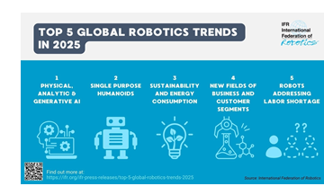 2025 年 1 月 22 日 —全球工业机器人安装市场价值已达到 165 亿美元的历史最高水平。未来需求将受到一系列技术创新、市场力量和新业务领域的推动。国际机器人联合会(IFR)发布 2025 年机器人行业的五大趋势。