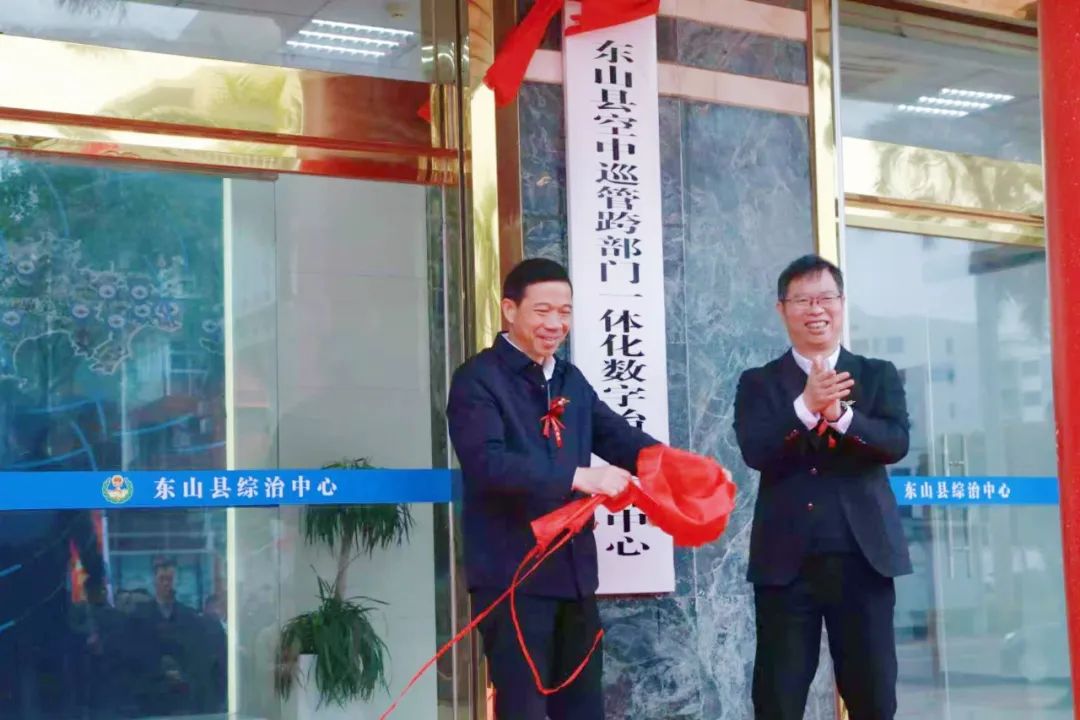 仪式上,蔡兴州副主席,何霭书记,刘兆民县长和陈方平博士共同为“东山县空中巡管跨部门一体化数字治理指挥中心”“东山县四维时空数字孪生大数据中心”进行了揭牌。