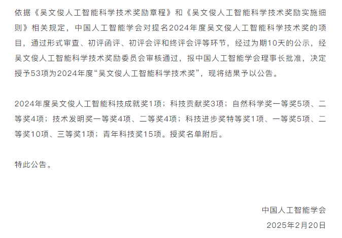 “吴文俊人工智能科学技术奖”被誉为“中国智能科学技术最高奖”,旨在奖励智能科学研究中取得重要发现,着力实现原始创新与突破,或在人工智能领域攻克关键核心技术,推动科学技术进步取得重大进展,创造巨大经济社会效益或者生态环境效益的单位或个人。