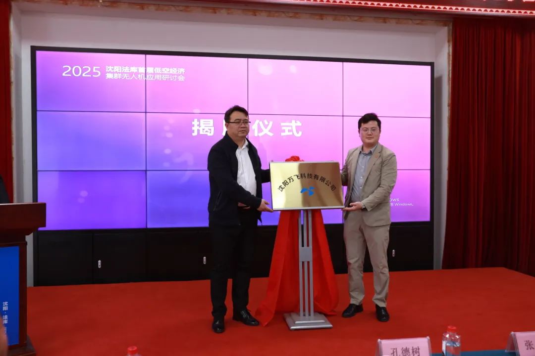 在全场嘉宾的见证下,法库县人民政府县长程廷霜与一飞智控集团总经理张云,共同为沈阳万飞科技有限公司入驻沈阳法库通用航空产业基地举行揭牌仪式。