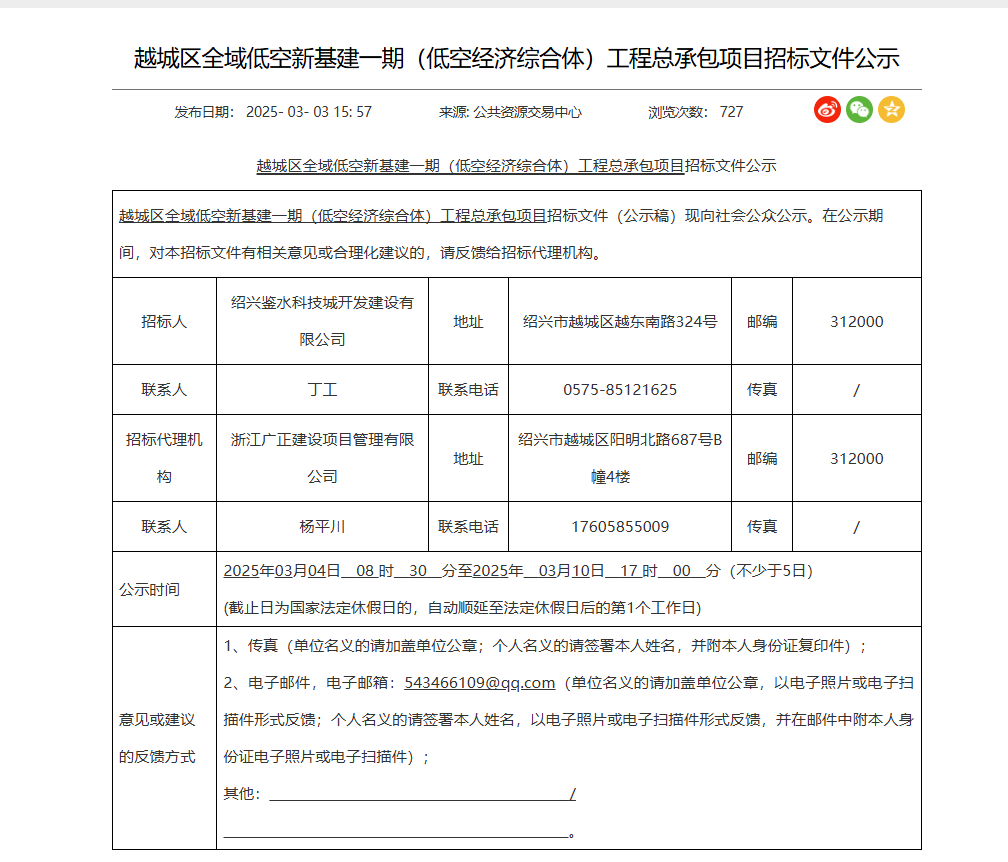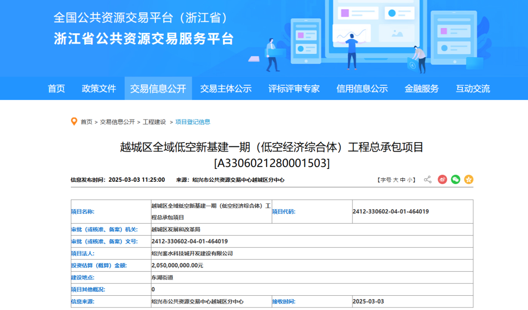 2025年3月3日,浙江省公共资源交易中心正式发布越城区全域低空新基建一期(低空经济综合体)工程总承包项目[A3306021280001503],总投资规模达20亿元,创下全国低空经济领域公开招标项目的最高纪录,同时也是全国首个以“全域低空新基建”命名的工程总承包项目,成为低空基建行业的新标杆,被视为国家低空产业从“试点探索”迈向“全域落地”的关键一步。
