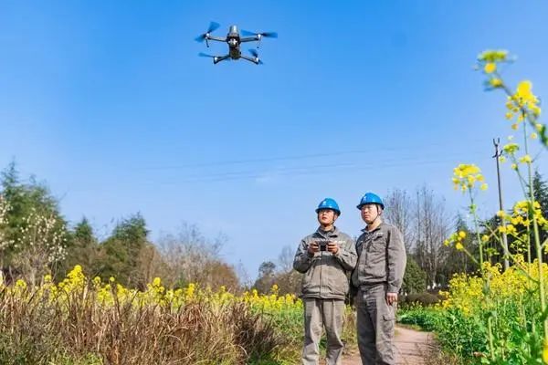 在邮亭镇复兴村,油菜花开遍地,国网重庆永川供电公司双桥供电中心员工龚宇、潘学宜穿梭于田坎间,对10千伏龙双线开展无人机巡检,以更加可靠、安全的电力服务春耕春灌。
