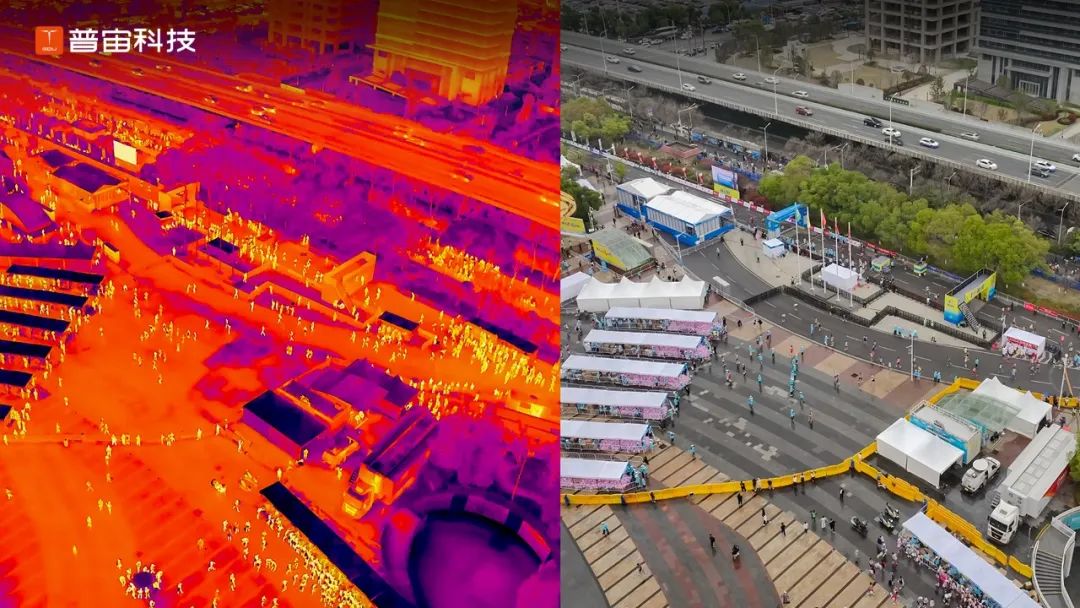 在比赛过程中,普宙科技在全马后半程东湖风景区沿线赛道及其它重要区域,利用无人机技术对赛场情况进行监测,弥补了高点监控的视线盲区;比赛期间,天空下起了小雨,搭载高清红外云台相机的无人机,可清晰显示现场动态,为安保人员提供了第一手的现场信息。