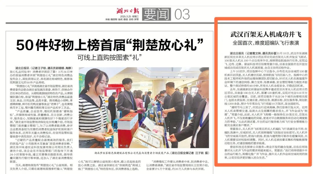3月25日,湖北日报以《武汉百架无人机在开放空域成功并飞 全国首次,难度超编队飞行表演》为题,详细报道了武汉市东湖高新区低空共享无人机应用示范区项目百架无人机在开放空域成功并飞的盛况。