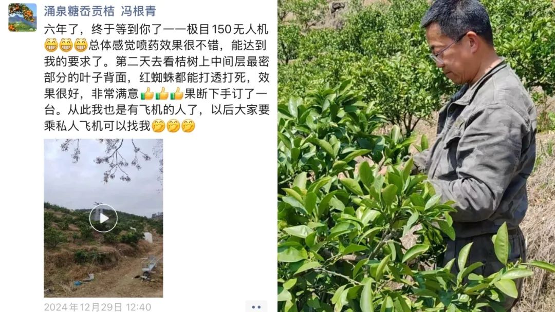 其实早在六年前,冯根青就已经开始关注农业无人机:“我家种了100亩的蜜桔树,打药确实很费力,但我还是更看重效果,尤其是能不能杀灭叶背的红蜘蛛。”