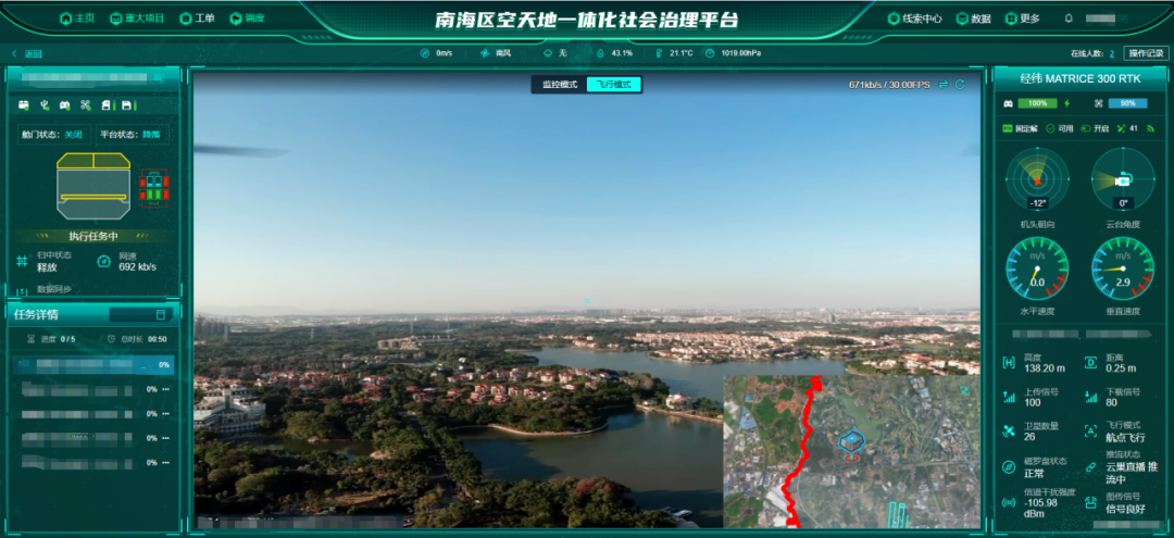 在技术融合创新方面,南海打造“空天地”智能中枢。传统无人机参与社会治理存在巡查覆盖面小、数据标准不一等诸多问题,南海通过“统一平台、统一标准、一飞多用”的技术创新,夯实数字底座。