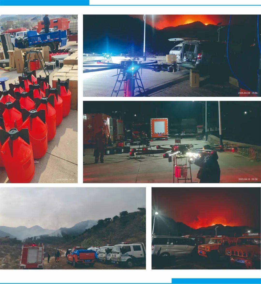 2025年4月8日,河北省秦皇岛市昌黎县和卢龙县交界处突发森林火情,火势迅速蔓延威胁周边居民安全。深圳市科卫泰实业发展有限公司积极响应河北省应急管理厅的紧急调度,第一时间派出专业保障团队及3架30kg载重灭火无人机并连夜赶赴现场,先后起飞无人机六十余架次,进行火情侦察及投弹灭火,先后抛投空爆灭火弹40余枚,水基灭火弹20余枚,灭火效果明显,充分发挥“新质生产力”的强大优势,展现了科技赋能应急管理的强大力量。