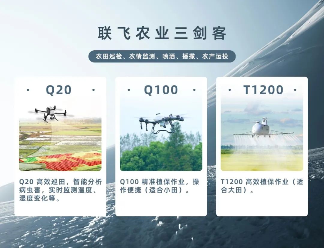 中航智「农业三剑客」Q20、Q100、T1200无人机协同作业,全面覆盖农林场景的多样化需求,助力智慧农业发展。
