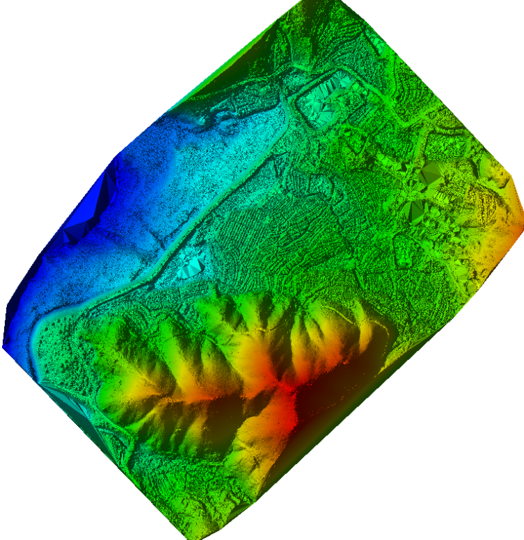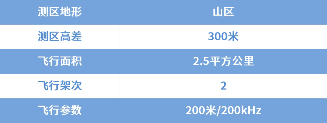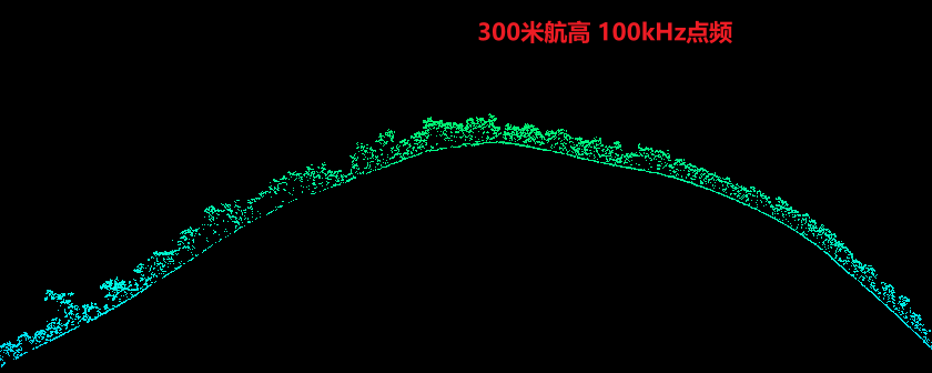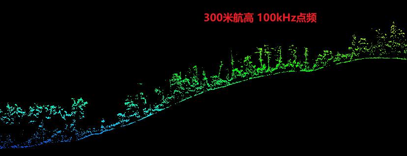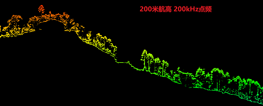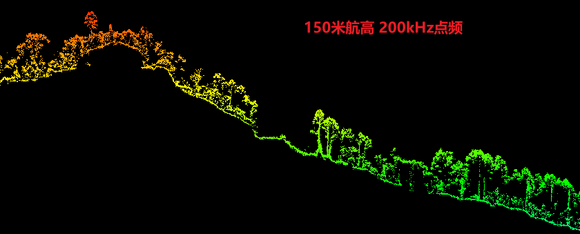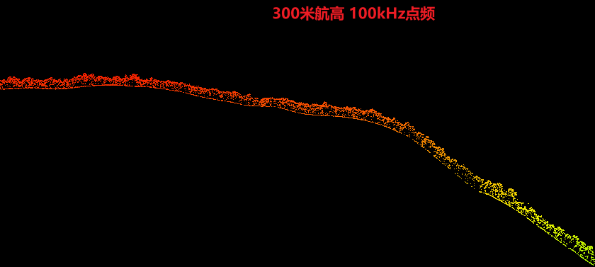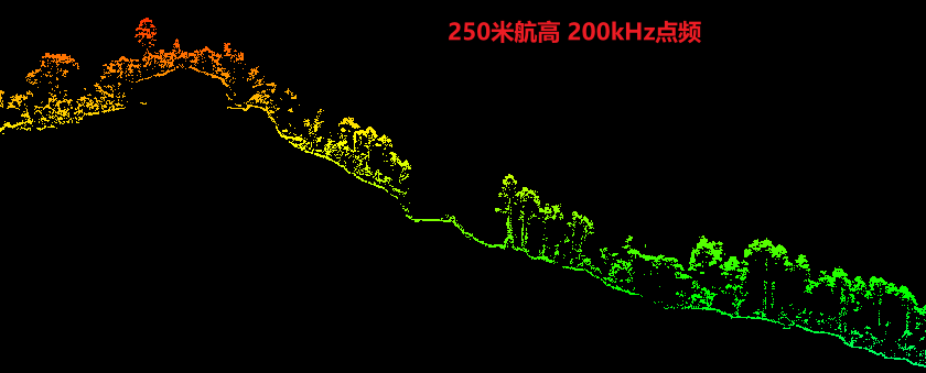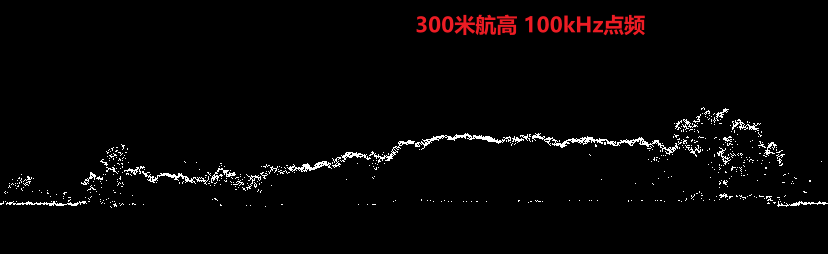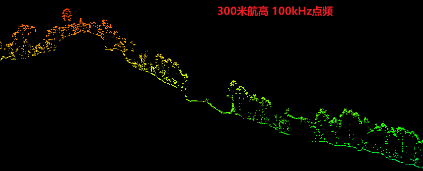 该测区河边超高密度植被覆盖区域,200米及以上航高可实现部分地形数据获取,但存在明显稀疏的情况;山区地形下,200米及300米航高下均可实现较好的连续地形数据获取。