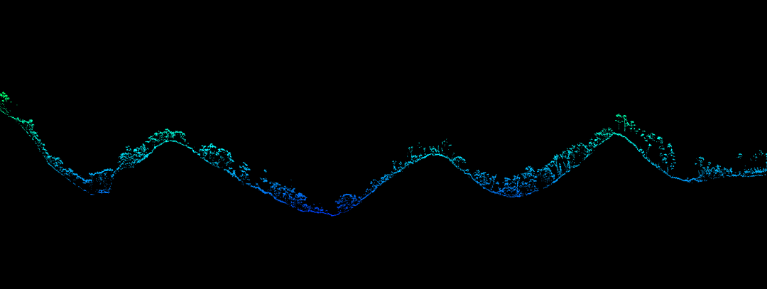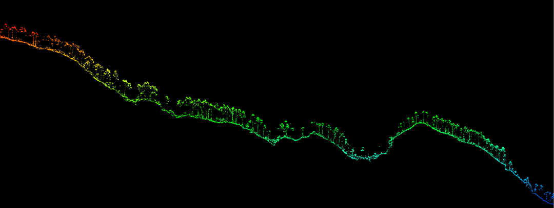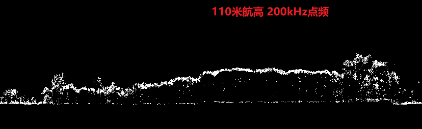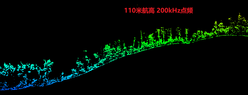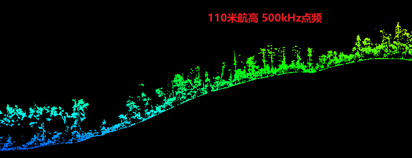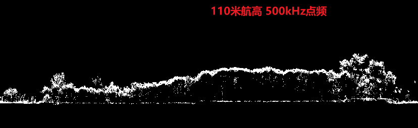 本次测试在110米航高下,选取了不同点频进行飞行测试,为验证其穿透性,选择在河边超高密度植被覆盖区域及山区植被覆盖区域各自进行剖面绘制、分析,可以看出110米航高下,两种点频达到的植被穿透性基本一致,但500kHz点频下,点云密度明显更高。