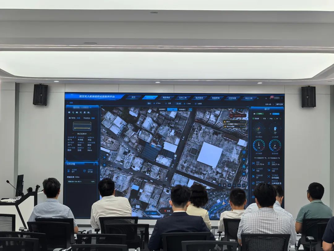 调研首站,广新集团领导一行来到中科云图广州研发总部展厅,深入了解公司核心技术成果与低空遥感多场景应用。在展厅内,调研组重点观看了中科天网无人机云平台的实时操作演示,并观摩了无人机从智能基站自动起飞、巡检作业到精准降落的全流程无人化飞行。