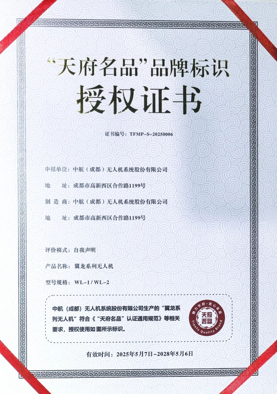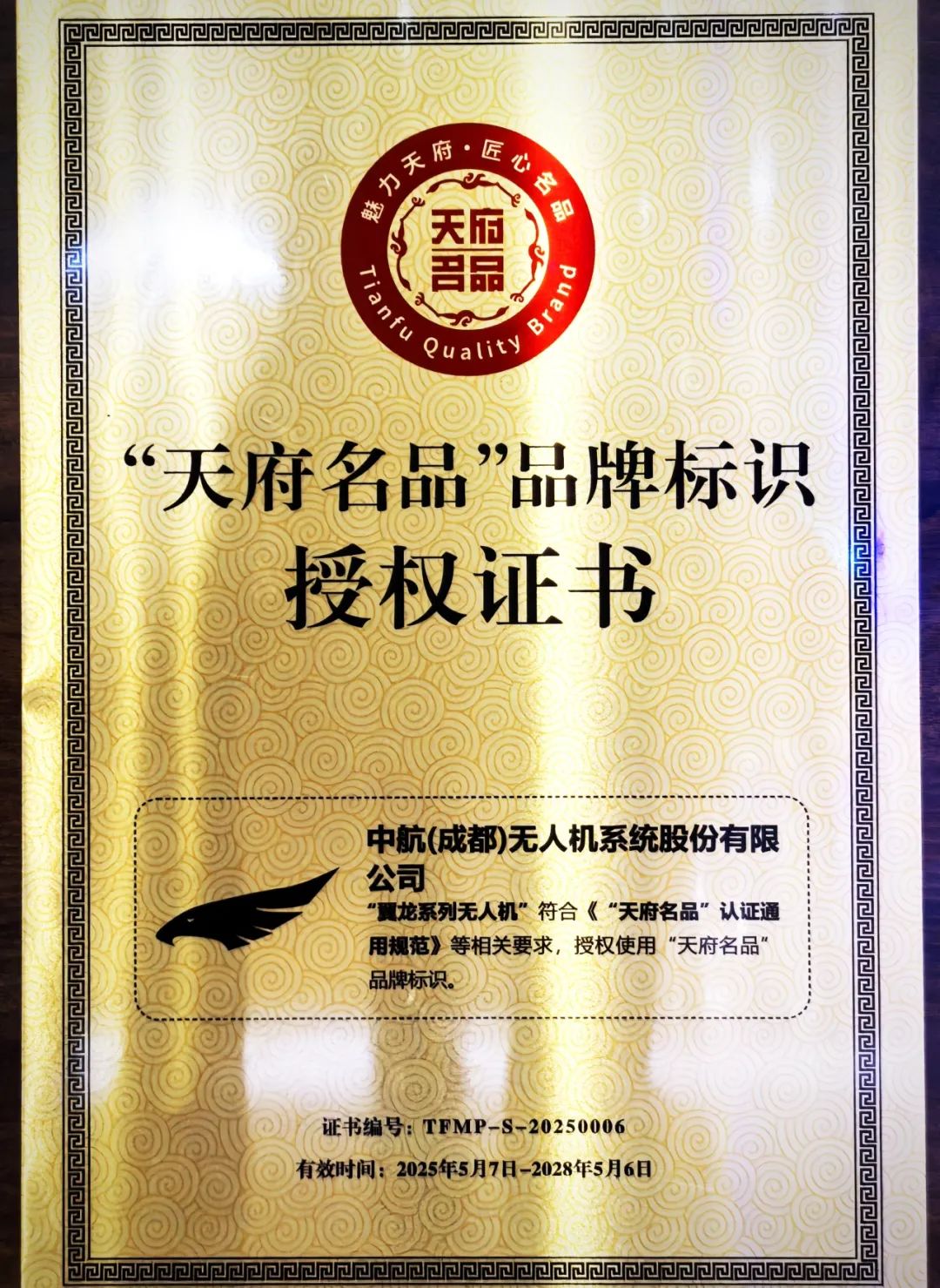 5月9日,由四川省发改委、四川省市场监督管理局主办的2025中国品牌日四川活动在东郊记忆举行,公司翼龙系列无人机获评“天府名品”品牌标识授权。
