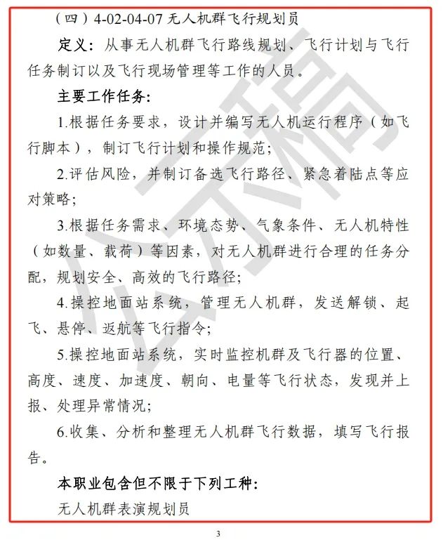 定义:从事无人机群飞行路线规划、飞行计划与飞行任务制订以及飞行现场管理等工作的人员。