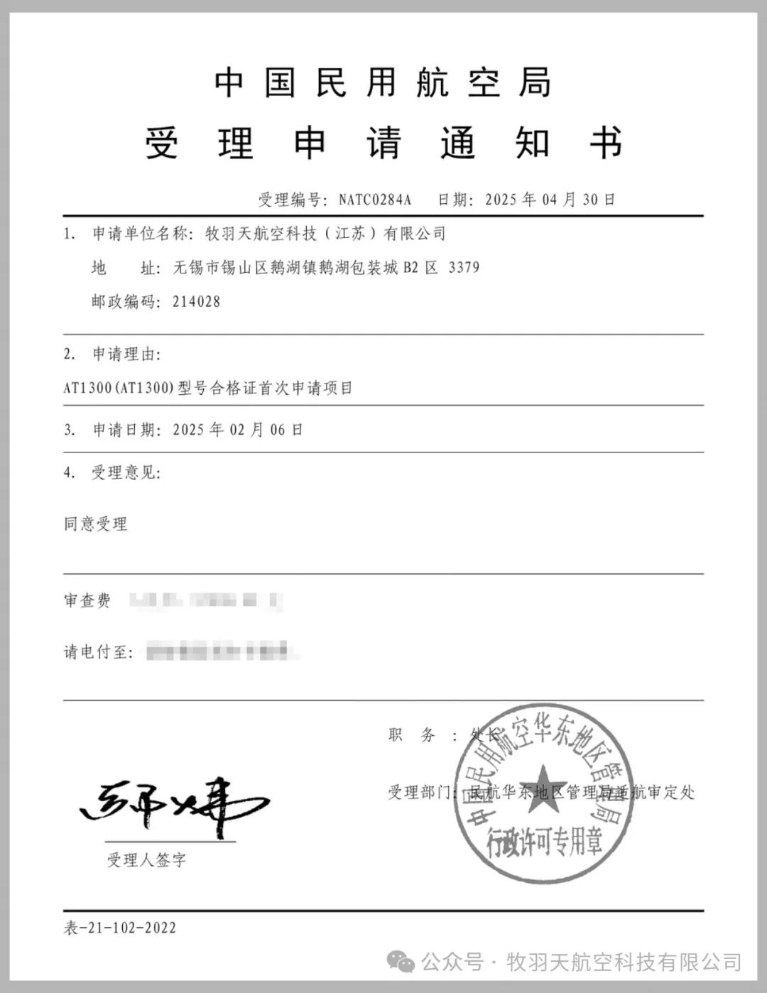 2025年4月30日,民航华东局正式受理了牧羽天航空AT1300“飞行重卡”无人驾驶航空器系统的型号合格证(TC)申请,这也是首款获民航局正式受理的吨级混合动力货运eVTOL飞行器。