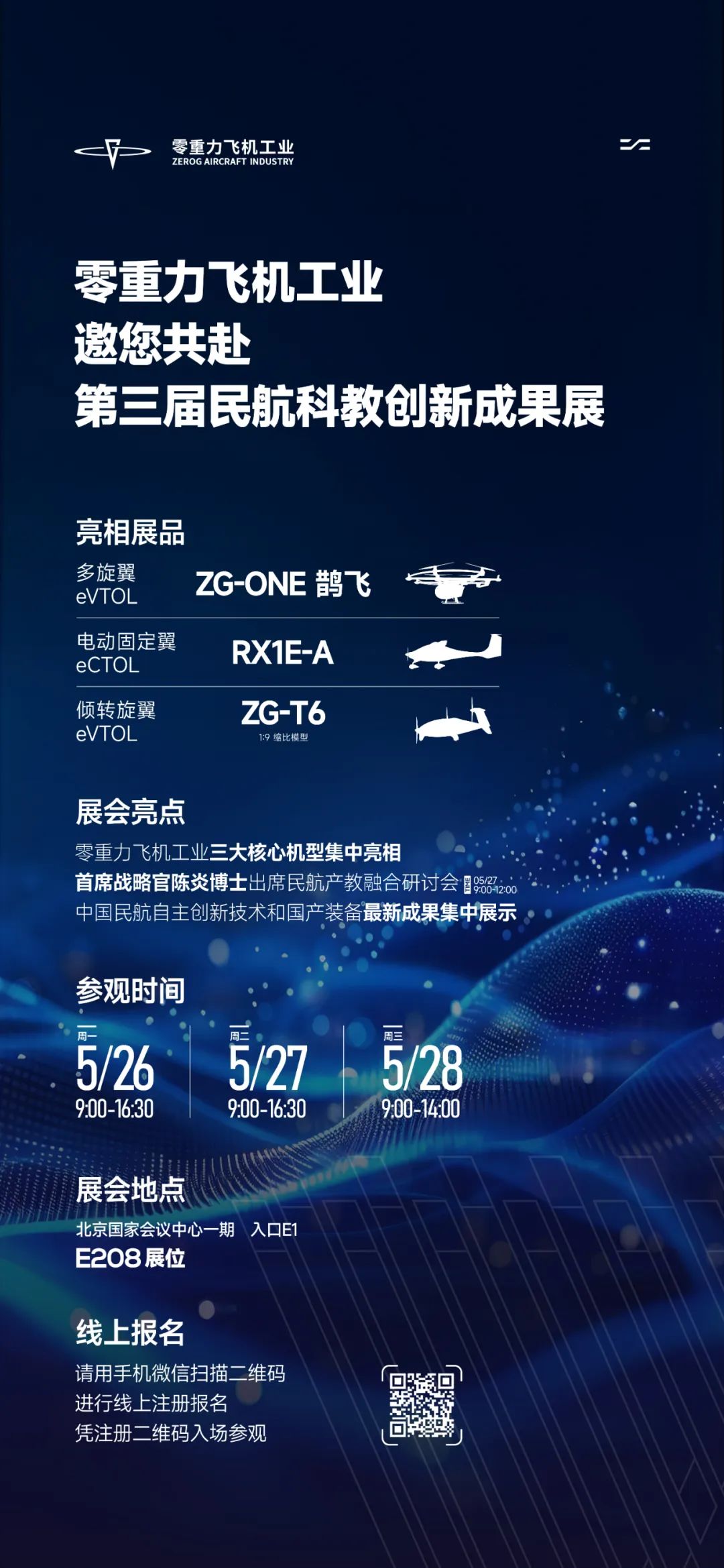 5月26日至28日,以“创新领航 智连世界”为主题的第三届民航科教创新成果展即将在北京国家会议中心盛大启幕。作为国内eVTOL领域的代表企业,零重力飞机工业也将深度参与其中。在低空经济展区,我们携核心产品两款真机ZG-ONE鹊飞、RX1E-A和ZG-T6缩比模型机在E208展位精彩亮相。