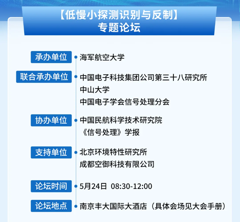 我们诚挚邀请各位同仁参加5月24日的【低慢小目标探测识别与反制】专题论坛。本次论坛将在前两届论坛成果的基础上,采用标准、专著和论文成果发布、数据集发布、海报展示、专家报告等多种形式,邀请领域专家共同研讨低慢小探测识别与反制技术的最新研究成果,推动声、光、雷达等多传感器探测与无线电侦测、干扰等技术进步。