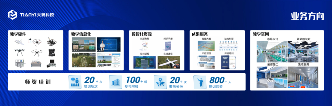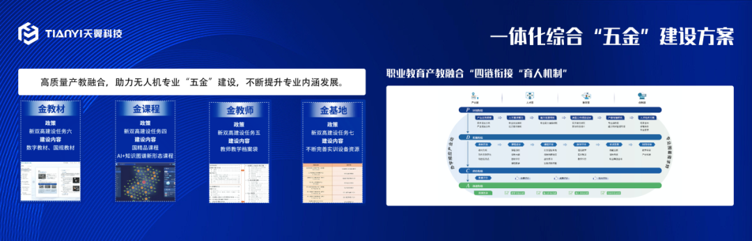 天翼科技展位上,以“低空经济背景下无人机专业建设”为主题的展示内容,集中展示了天翼科技在“五金”建设、教学资源、赛事支持、职教出海等各个板块的最新成果。