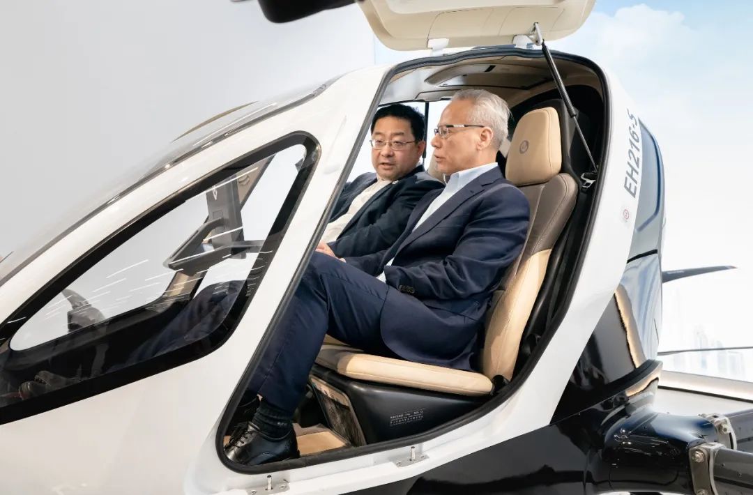 图:澳门特首岑浩辉与亿航智能首席运营官王钊共坐EH216-S交流