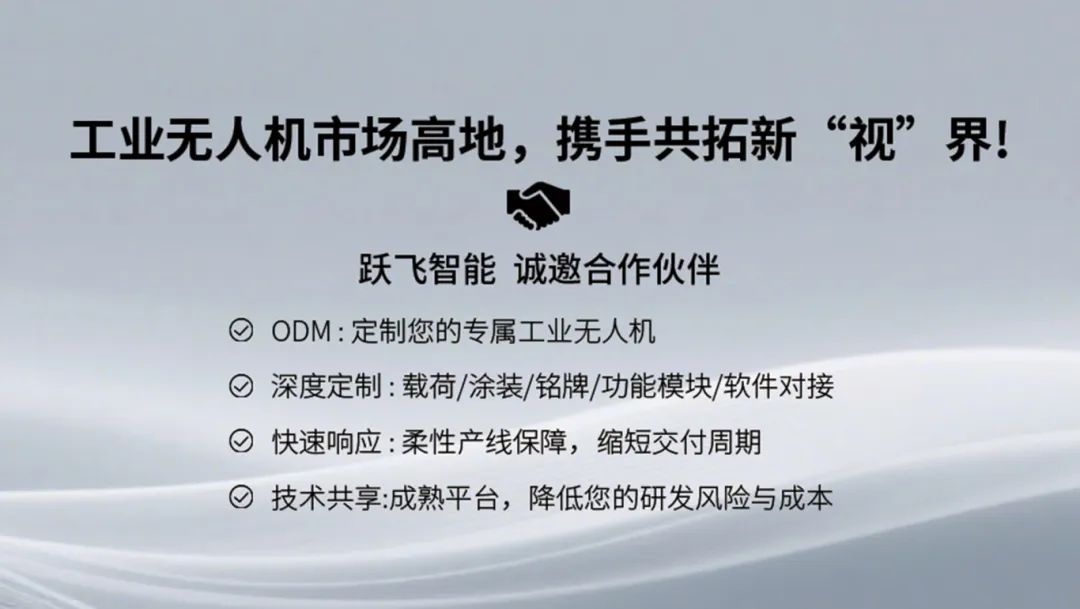 南京跃飞智能科技有限公司是优秀的行业无人机解决方案提供商,从事无人机产品软硬件 系统集成和销售,为相关行业客户提供了大疆、科比特等多个知名品牌的无人飞行器、飞行控制系统、机载任 务载荷、无线数据和图像传输系统以及专业的数据处理软件,拥有丰富的解决方案、专业的销售和服务网络。
