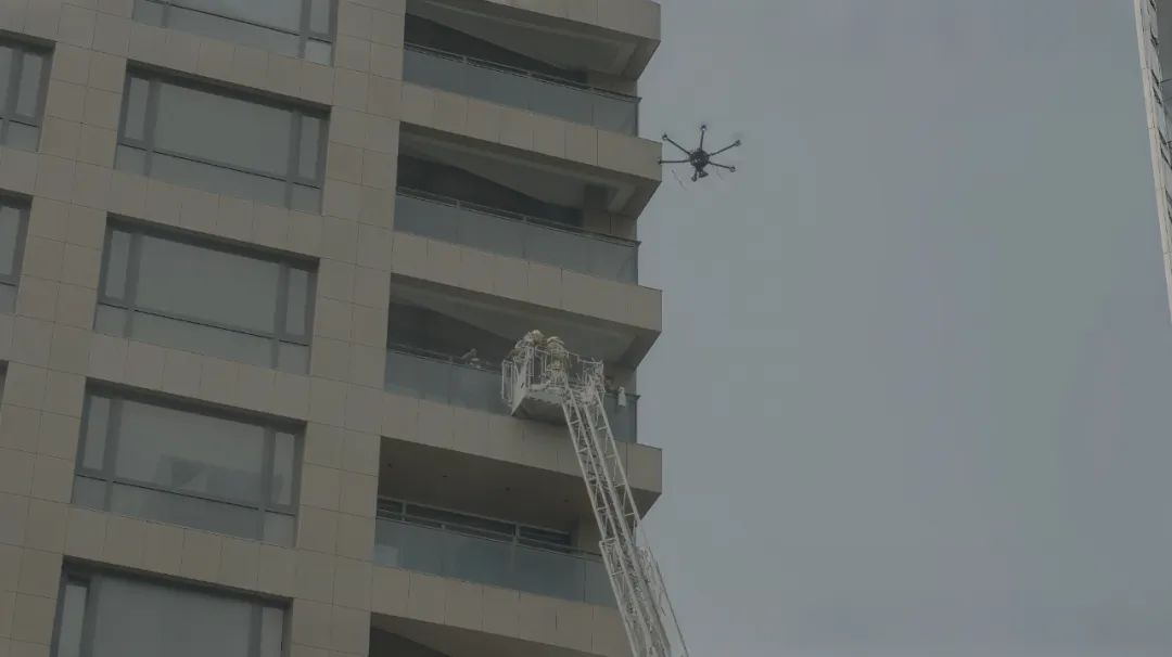 针对楼房、工厂、油库等城市化密集区域火灾,容祺智能的无人机可同时搭载破窗器和灭火弹,通过高速撞击破除玻璃障碍后,再配合高温识别与自动转向系统,立即将灭火弹、阻燃液等投送至楼房内部着火区域,可以有效避免火势封闭蔓延。同时我们的无人机还支持连接柔性消防水管,利用机载动力系统将水管牵引至楼层高点,为地面消防员提供垂直供水路径,特别适合城市中高层建筑的灭火作战辅助。