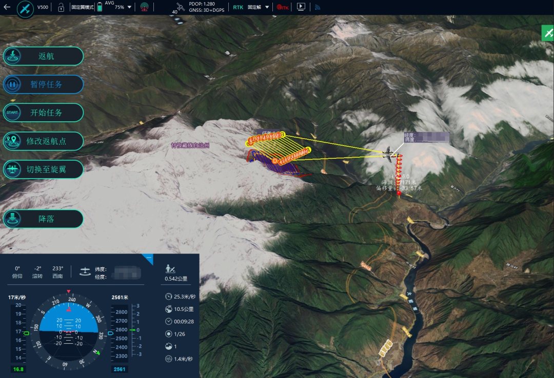2024年8月3日,在四川省甘孜区域突发的山洪泥石流灾害中,V500同样发挥了重要作用。由于测区内山高谷深、海拔高差大,普通设备难以开展作业。V500无人机从距测区10km的起降点进行远距离飞行,飞行高度达2700 米,作业高度达5000 米。经过 2 个架次的飞行,快速高效获取了20余平方公里正射成果数据,完成了地质灾害应急处置的多项关键工作,为灾区范围确定、指挥决策以及应急救援提供了高效优质的测绘地理信息技术支撑。