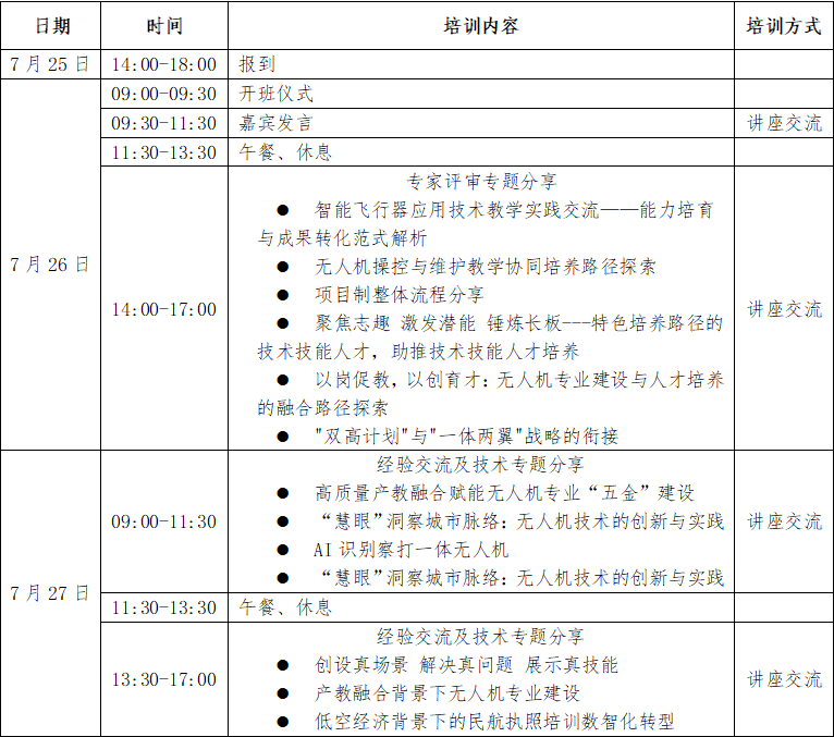 为深入推动低空经济背景下的无人机专业建设和人才培养,满足社会对低空行业人才的迫切需求,全国航空工业职业教育教学指导委员会定于2025年7月26日-30日举办“双高筑基·强师精技—职业院校高水平专业建设融合实践”专题研修班。本次研修班旨在依托双高专业群建设成果,夯实卓越教师的技能根基,强化各院校及相关单位人才梯队建设,推进职业院校相关专业和人才培养模式,现就有关事项通知如下: