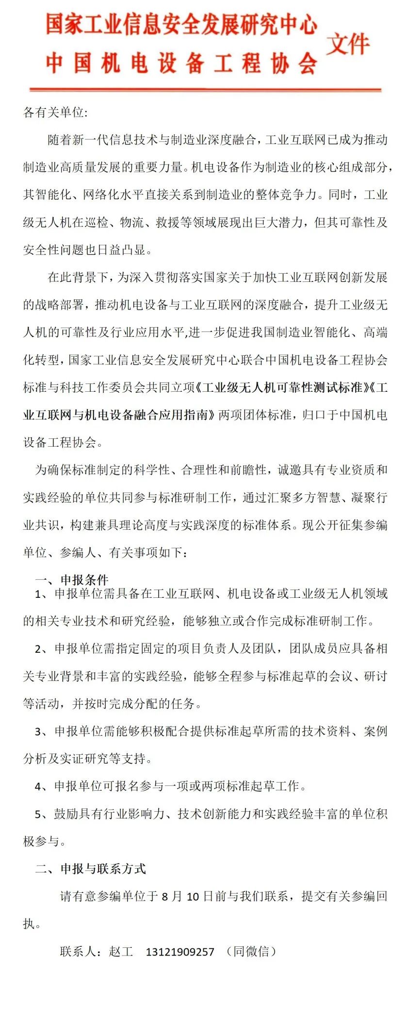 为深入贯彻落实国家关于加快工业互联网创新发展的战略部署,推动机电设备与工业互联网的深度融合,提升工业级无人机的可靠性及行业应用水平,进一步促进我国制造业智能化、高端化转型,国家工业信息安全发展研究中心联合中国机电设备工程协会标准与科技工作委员会共同立项《工业级无人机可靠性测试标准》《工业互联网与机电设备融合应用指南》两项团体标准,归口于中国机电设备工程协会。