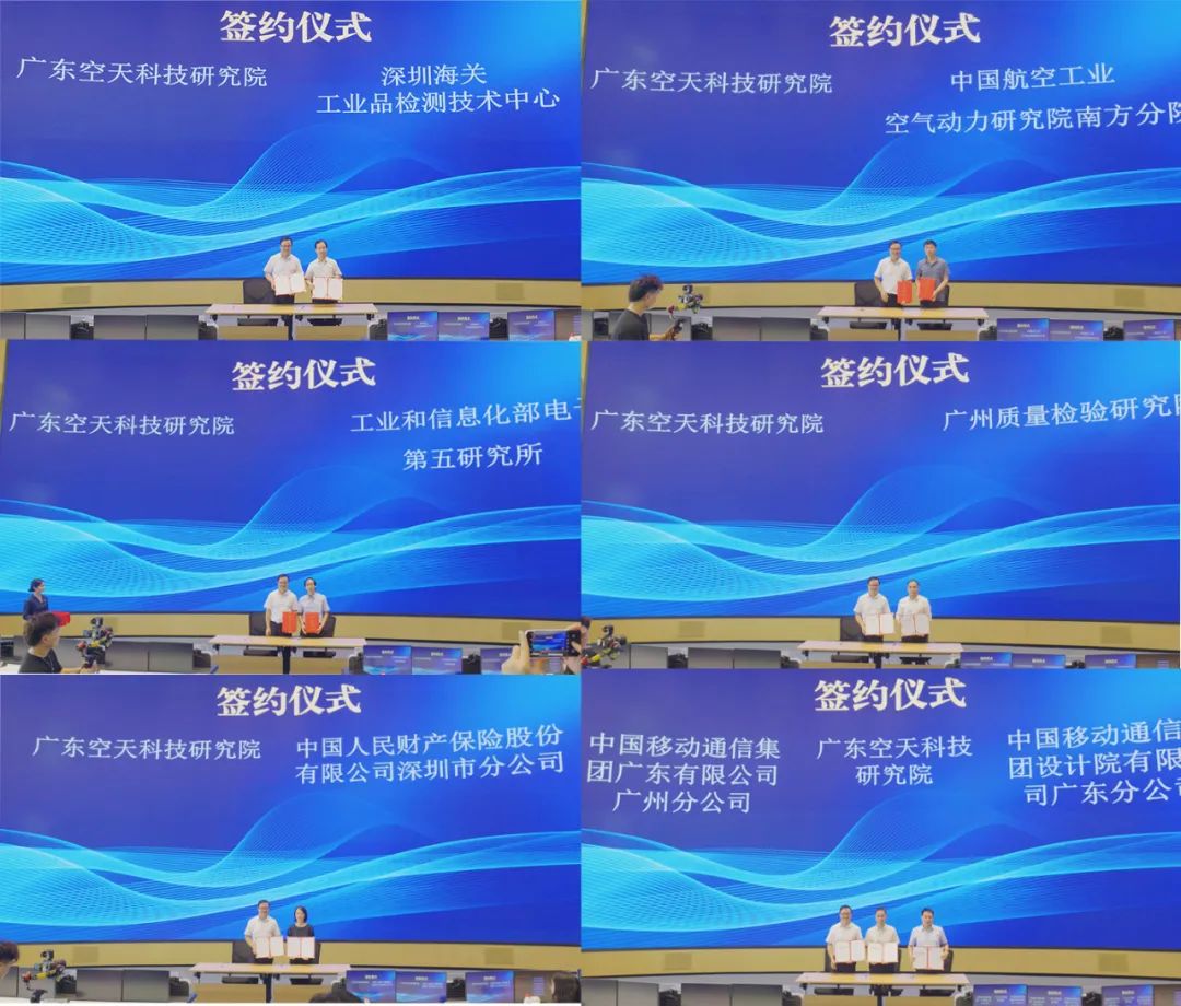 仪式上,广天院还分别与深圳海关工业品检测技术中心、中国航空工业空气动力研究院南方分院、工业和信息化部电子第五研究所、中国人保集团深圳分公司、广州质量检验研究院、中国移动通信集团设计院有限公司广东分公司以及中国移动通信集团广东有限公司广州分公司等7家单位签订了战略合作协议,将从设施共享、标准研制、平台共建、科技保险、技术创新等方面开展合作,共同推进低空经济产业发展。