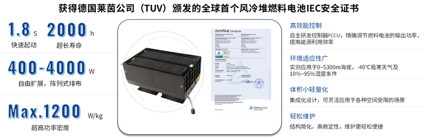 除续航优势外,经实验验证,氢氧在极低温度下(-196°℃)也可以在Pt、Rh、Pd等金属催化剂下发生电化学反应,氢燃料电池的低温适应性相较锂电也具备极大优势。氢航科技的空冷型氢燃料电池通过自研专利技术,将最大常压裸堆功率密度突破至1200W/kg,在搭配氢气瓶进行发电后,平均每公斤氢气可产生15-16度电。此外,氢航科技通过先进的环境适应性管理控制技术及模块,将电堆最低运行环境温度拓展至-40℃、最高使用海拔拓展至5200米,且均通过实际场景检测。因其独创技术与电堆性能优势,该氢燃料电池满获CE认证、全球首个IEC安全认证、五十余项专利成果、十余项发明专利等多项成绩与荣誉,是行业公认的顶尖水准。